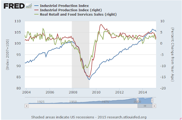The red, graphed on the right scale, is IP YoY. The green real retail YoY.